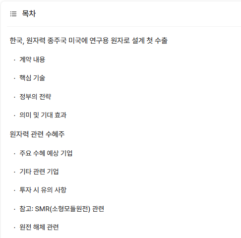 - 정부는 2035~2036년 SMR 상용화 실증 1기 가동을 목표로 하고 있다.