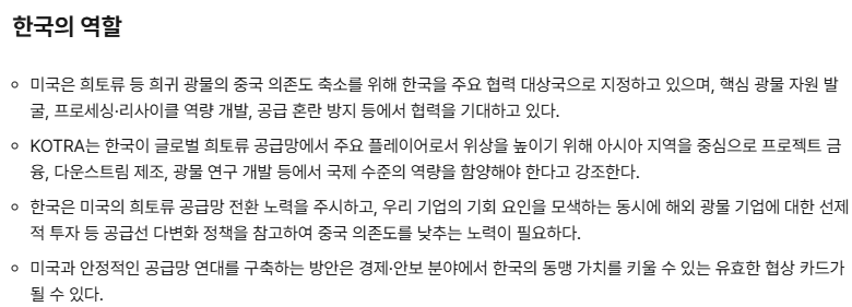 한국은 이에 대한 선제적 대응 전략 마련이 필요하며, 기업과 정부 모두 공급망 안정성을 확보하기 위한 장기 로드맵 수립이 시급합니다.