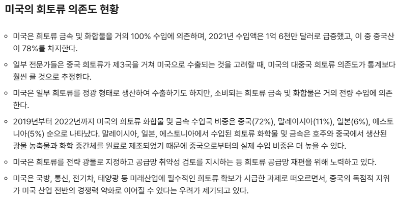 - 미국의 희토류 의존도와 공급망 재편 시나리오