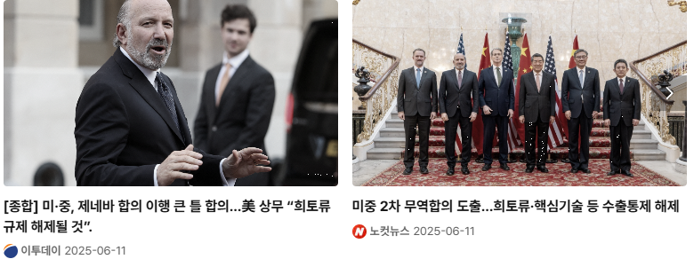 이는 중국이 희토류 수출 통제 카드를 접고 유화적 태도로 전환했음을 뜻하며, 미국 입장에서는 자원 안보 확보라는 전략적 성과입니다.