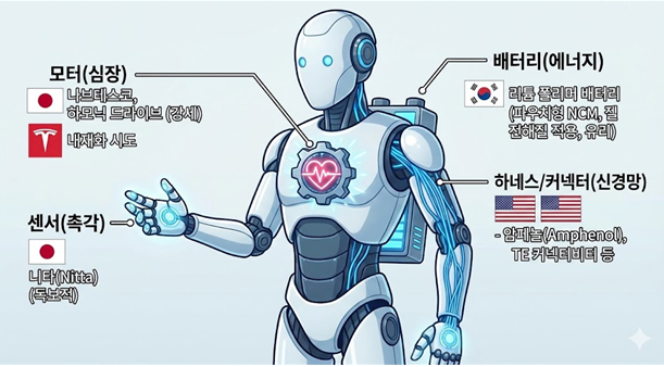 - 모터(심장): 로봇 원가의 가장 큰 비중. 일본의 나브테스코, 하모닉 드라이브가 강세이나 테슬라는 내재화를 시도 중.