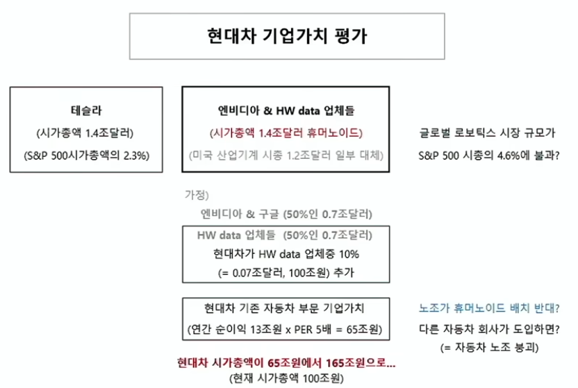 - 현대차의 몫: 이 시장에서 현대차가 약 $10%$의 점유율만 가져가도, 약 100조 원의 추가 기업 가치가 발생합니다.