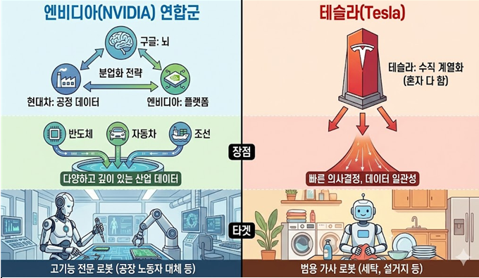 | 전략 | 분업화 (구글: 뇌, 현대차: 공정 데이터, 엔비디아: 플랫폼) | 수직 계열화 (혼자 다 함) |