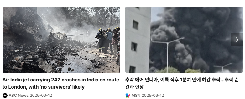 2025년 6월 13일 인도 아마다바드 국제공항을 출발해 런던으로 향하던 에어인디아 AI171편 보잉 787 드림라이너가 이륙 직후 추락했습니다. 총 242명이 탑승한 이 항공기는 공항 인근 주거지역에 추락하며 대형 화재와 구조 피해를 초래했습니다. 소방당국은 즉각 출동해 진화 및 수색 구조를 벌였으며, 사망자 수는 계속 증가 중입니다.