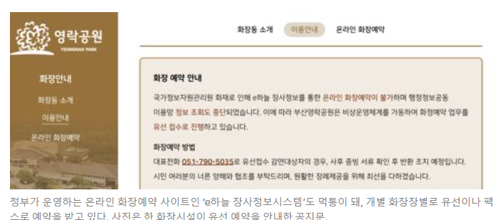 정부 화장시설 예약 시스템인 ‘e하늘 장사정보시스템’도 멈춰버림요.