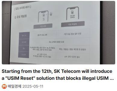 SK텔레콤은 최근 유심 정보 유출 사태에 대응하기 위해 2025년 5월 12일부터 '유심 재설정' 기능을 도입했습니다. 이는 기존 유심 칩을 물리적으로 교체하지 않고도, 식별 및 인증 정보를 서버를 통해 안전하게 변경하는 보안 기술입니다.
