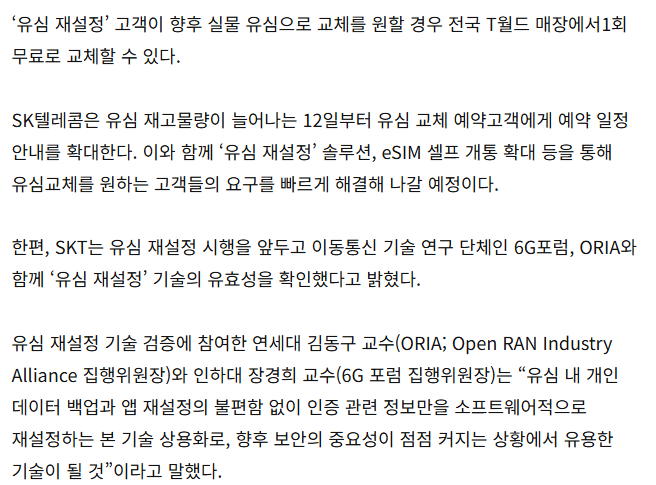 또한, 만약 재설정 후에도 불안감을 느끼거나 실물 유심을 교체하고 싶다면, 2025년 4월 18일 이전 가입자는 1회에 한해 유심 또는 eSIM을 무료 교체할 수 있습니다.